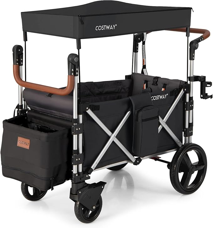 This wagon makes the most sense for families who want two real child seats, push-or-pull flexibility, and better control on longer outing days than a basic pull cart gives you. The adjustable push and pull handles, suspension-backed wheels, rear brake, canopy, and tray-and-storage setup point to a wagon that is built more for zoo trips, parks, and travel days than for tight daily city errands.