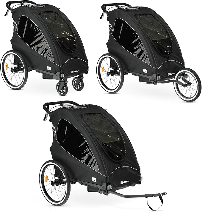 The Deryan 3-in-1 Bike Trailer is a single-child crossover option for families who want a more compact trailer-and-stroller setup than the bulkier two-seat designs.