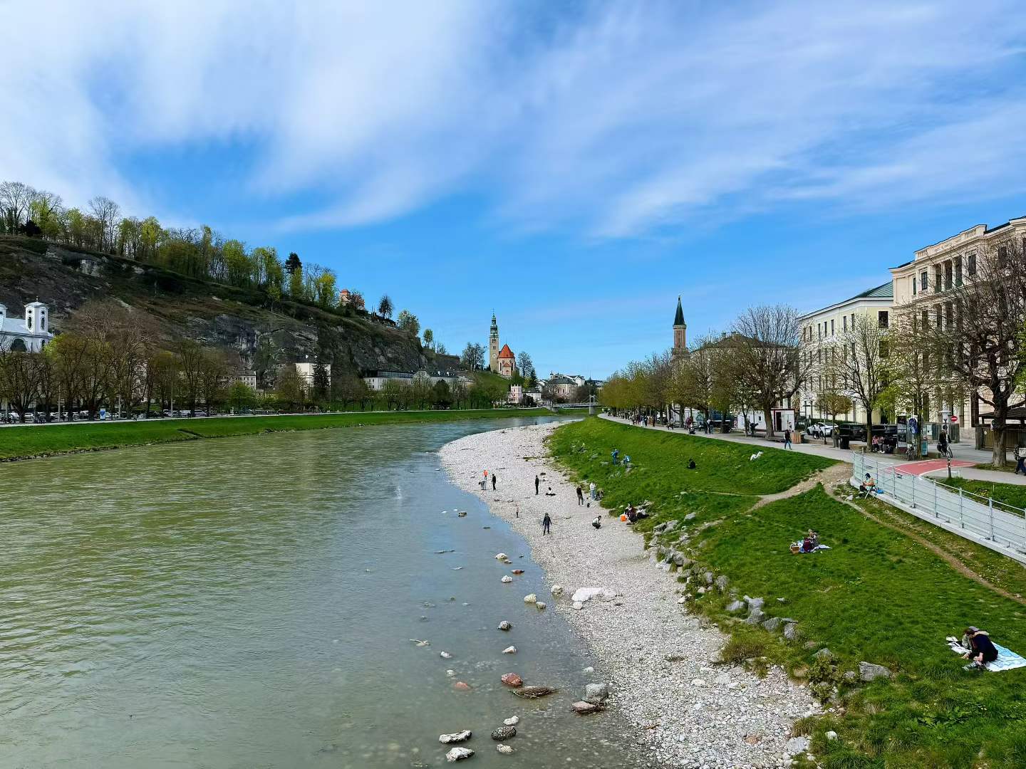 Salzburg gave us the stronger “we are somewhere special” effect. From the station we could reach Mirabell Gardens on foot, then cross the river, pass Mozart’s birthplace, follow the iron guild signs through the old town, and climb to a viewpoint with the fortress and church domes spread out below.