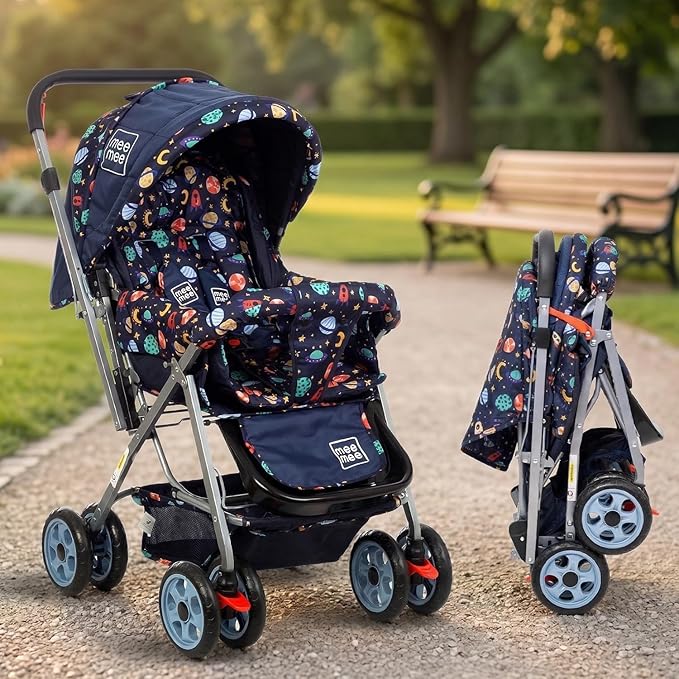 Mee Mee Little Explorer reversible handle और three-position recline के कारण short outings में caregiver visibility और naps के लिए useful है। यह compact travel या all-terrain stroller नहीं लगता, इसलिए flights, rough roads या small boot use से पहले dimensions और wheel feel check करें।फायदे
