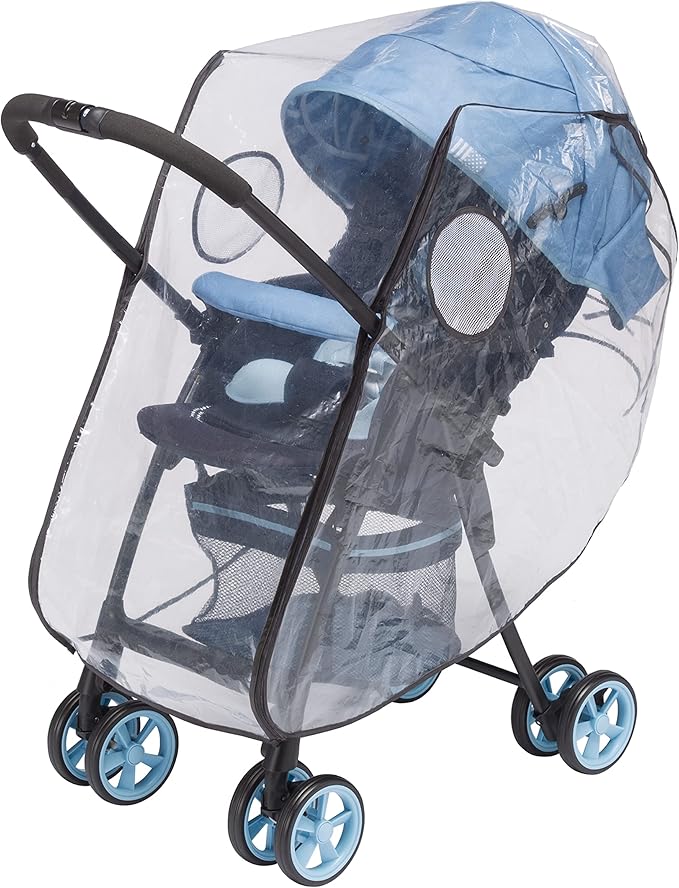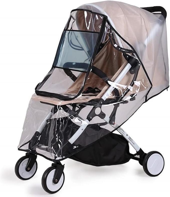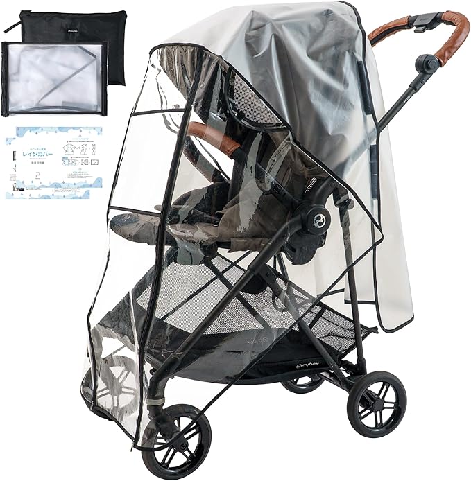 一般的な一人乗りベビーカー向けの、透明タイプの汎用レインカバー。機能はシンプルなので、追加の開閉機能よりも手持ちのベビーカーに無理なく合うかを先に確認したい家庭向けです。