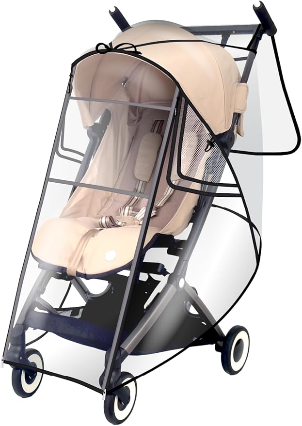 前面ファスナーで開けられる汎用レインカバーで、サイド通気口と足元まで届きやすい長めの前丈が特徴。持ち歩きやすさを保ちつつ、おやつ、ベルト調整、乗せ降ろしのしやすさも欲しい家庭に合います。