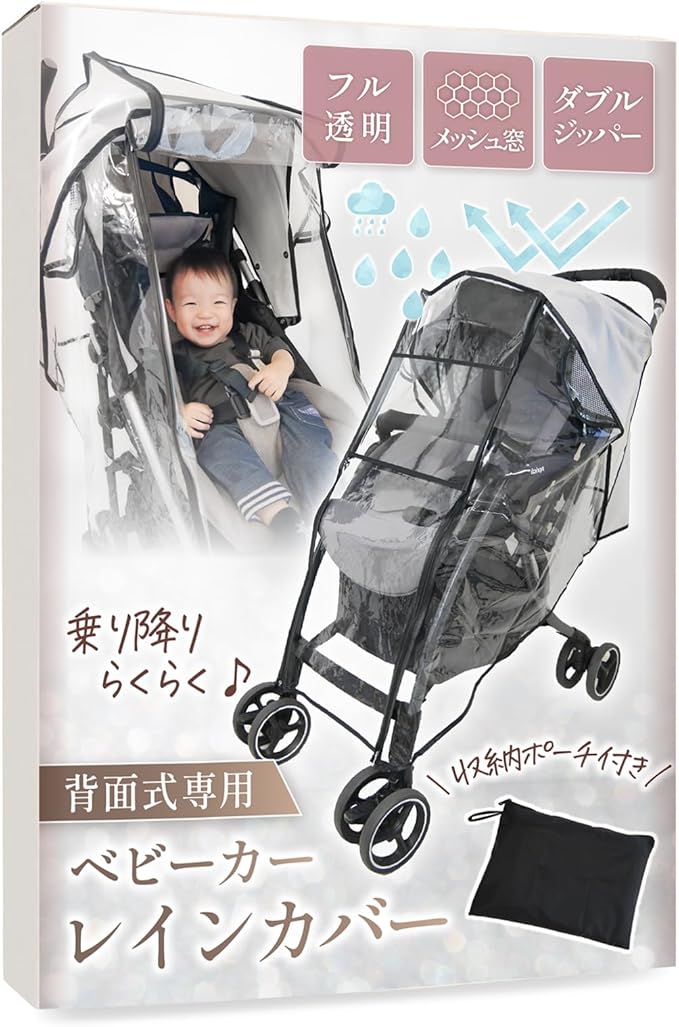 背面式のA型・B型ベビーカー向けの汎用レインカバー。前面の見やすい窓、サイドの通気口、止水ファスナー、収納ポーチがそろっているので、保育園送迎や買い物中に毎回カバーを外したくない家庭に向きます。